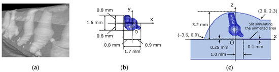 Since many of the defects observed in the X-ray CT of the specimens had similar shapes, a three-dimensional defect model was created based on the X-ray CT results as shown in Figure 8a, combining cones and a sphere, whose external forms are shown in Figure 8b,c.