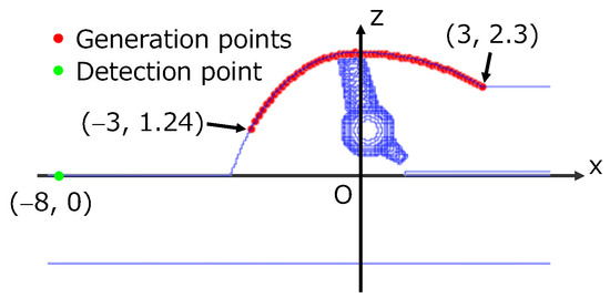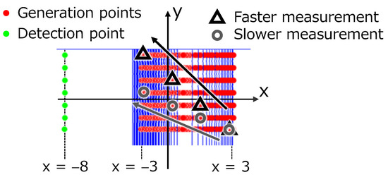 In this study, we examined a measurement method that was single-point detection and multi-point generation, but not the simultaneous excitation of ultrasonic waves at multiple points. In other words, the experimental conditions shown in Figure 3 resulted in 61 excitation and detection points per cross-section. On the other hand, the software analyzes a single ultrasonic propagation at once. Thus, analysis of one cross-section requires 61 calculations. To obtain more efficient analytical results, we focused on the wave reciprocal theorem, widely known in ultrasonic testing research. The reciprocal theorem states that switching the generation and detection points can obtain the same waveforms. Applying this to the irradiation conditions in this study means that the same waveform is obtained by one generation point and multiple detection points after exchanging the generation and detection positions. This allows us to obtain the B-scope of one cross-section in one calculation. Therefore, the generating and detecting points are exchanged in the subsequent analysis. However, the notation of generation/detection in the figures indicates the original position. As in the experiment, the generating and detecting points in the xz plane were set in the range x = −8 mm for the detecting point and x = −3~3 mm for the generating point in 0.1 mm gaps, as shown in Figure 9.