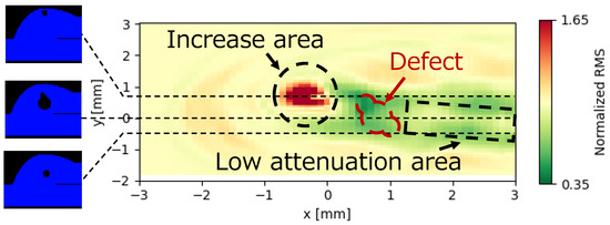 Furthermore, in areas where defects existed near the surface, the normalized RMS value increased due to reflections from the defects, as shown by the black dotted circular line. The increasing area was on the negative x-axis, meaning on the left side of the figure, which caused the slope of the RMS distribution to be large and negative, as shown in the schematic diagram in Figure 13. This makes determining the defect easier. It was found that this method, which aimed to capture the attenuation, not only captured the attenuation but also a signal increase close to the detecting point when a defective reflected wave was observed.