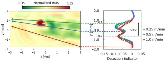 The data obtained by measurements with traveling were equivalent to acquiring data obliquely on the RMS map. At higher traveling speeds, this oblique angle becomes larger, which is supposed to reduce the probability of passing through the attenuation zone, indicating a defect. The traveling measurement was calculated by selecting data from the results shown in Figure 12. Thirteen points were picked up every 0.5 mm in the x-axis direction according to the experimental conditions for traveling measurements described in Figure 6. When the repetition rate of the laser was 100 Hz and the traveling speed was 0.5 m/min, the distance traveled in the y-axis direction per irradiation resulted in 0.08 mm. Therefore, the B-scope of the 0.5 m/min traveling measurement can be reproduced by picking up the point every 0.5 mm on the x-axis and every 0.08 mm on the y-axis. The cases with 0.25 and 1.0 m/min traveling speeds can be reproduced by picking up the point every 0.04 and 0.16 mm in the y-axis, respectively. An example of a path on the normalized RMS map at each speed is shown in Figure 14.