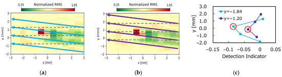 Change in the RMS distribution with a change in measurement position at 0.5 m/min. (a) Starting at y = −1.84 mm. (b) Starting at y = −1.20 mm. (c) Detection indicator distribution starting at y = −1.84 mm, y = −1.20 mm.