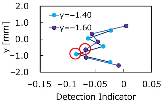 In the case of actual measurement, since one pass irradiation includes 13 points, the following path starts at a point 13 points ahead in the y-axis direction from the start point of the previous path. Figure 15a,b shows the paths when the measurement starts at y = −1.84 mm and y = −1.20 mm for a traveling speed of 0.5 m/min, and Figure 15c shows the distribution of the detection indicator values calculated for each path. A larger absolute value of the detection indicator means that the defect is more likely to be determined as a defect. In this case, the detection indicator starting the measurement at y = −1.84 mm is about twice that at y = −1.20 mm. Therefore, even when we measure the same defects at the same traveling speed, the ease of defect identification depends on the starting position of the measurement. Similarly, Figure 16 shows a result for a 0.25 m/min traveling speed. Figure 16 also shows that the ease of defect discrimination varies depending on the measurement start position.