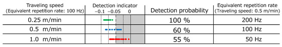 As shown in Figure 15c, the maximum absolute value of the detection indicator depends on the starting position of the measurement, even for the same defect. Only the maximum value obtained by each starting position is summarized by traveling speed in Figure 17. When the traveling speed was 0.25 m/min, the distribution was −0.085~−0.067, and when the traveling speed was 1.0 m/min, the distribution was −0.073~−0.014. The distribution approached zero as the traveling speed increased. Assuming that a defect is judged to be detected when the indicator is less than −0.05, the detection probability at each traveling speed is as shown in Figure 17, and it was confirmed analytically that the slower the traveling speed, the easier the defect is detected.