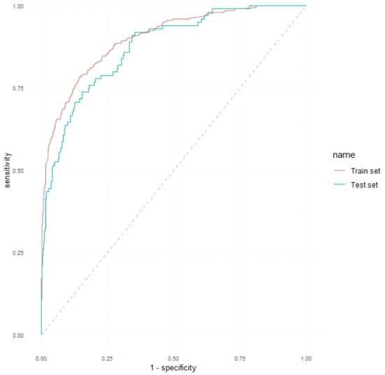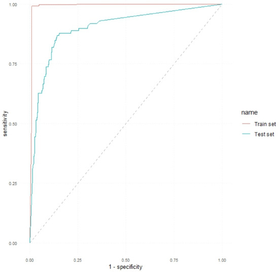 The ROC curves of the RF classifier for both the training and test sets can be visualized in Figure 2.