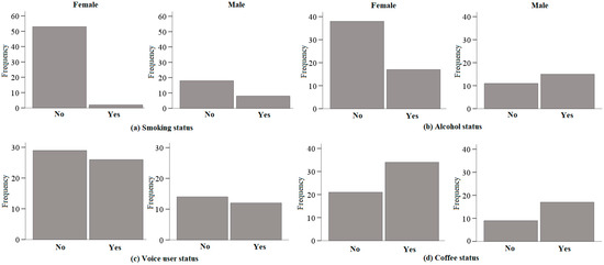 Figure 1 shows histogram distributions of the different categories based on the status of the participants. Males tend to smoke more than females, while the patterns regarding alcohol consumption are similar for both genders. Additionally, females tend to consume more coffee than males. Moreover, both females and males frequently confirmed that they were not voice users.