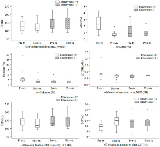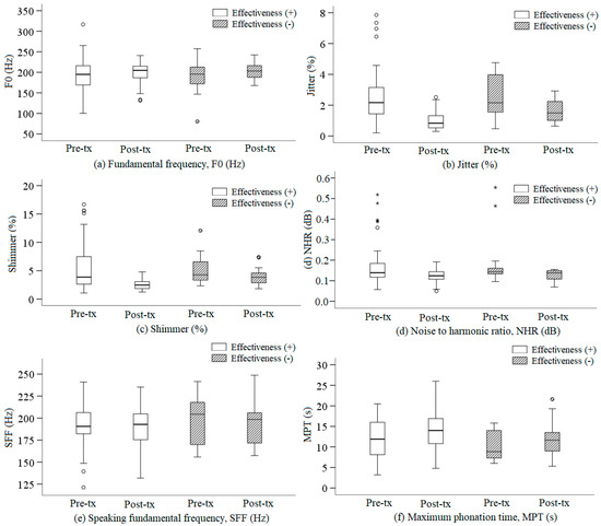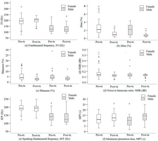 Figure 2 presents distributions of various acoustic parameters in the form of box plots, which provide better visualization before and after treatment for females and males. As shown in Figure 2a, for females, F0 showed a distribution ranging from 80 Hz to 316 Hz before treatment (Pre-tx), with a median of 194 Hz, and a distribution ranging from 131 Hz to 242 Hz after treatment (Post-tx), with a median of 204 Hz. For males, F0 showed a distribution ranging from 85 Hz to 230 Hz before treatment, with a median of 144 Hz, and a distribution ranging from 87 Hz to 235 Hz after treatment, with a median of 147 Hz. As shown in Table 2, the pre- and post-treatment F0 values for both genders were not significantly different and exhibited a typical positive linear correlation. Based on the results, as F0 exhibits differences based on gender, it is essential to examine the patterns according to gender when analyzing variables related to F0. Jitter reflects the consistency of the oscillation cycle and the variation in the F0 mean, and it is associated with the level of roughness. As shown in Figure 2b, jitter values showed significant differences both before and after treatment for both female and male voices (p < 0.001), although jitter extracted from male voices showed a weak correlation. For females, jitter showed a distribution ranging from 0.2% to 7.854% before treatment (Pre-tx), with a median of 2.166%, and a distribution ranging from 0.296% to 2.920% after treatment (Post-tx), with a median of 1.144%. For males, it showed a distribution ranging from 0.318% to 4.340% before treatment, with a median of 2.173%, and a distribution ranging from 0.304% to 2.444% after treatment, with a median of 0.628%. The diagram presented in Figure 2c illustrates the perturbation of glottic vibration, signifying the amplitude of the sound wave. This perturbation is linked to alterations in the level of voice breathiness and variations in intensity. Similar results were observed for shimmer (p < 0.001 and p = 0.013) as seen for jitter, although shimmer showed weak correlations for both females and males. For females, shimmer showed a distribution ranging from 1.075% to 16.681% before treatment (Pre-tx), with a median of 4.15%, and a distribution ranging from 0.237 to 7.394% after treatment (Post-tx), with a median of 2.792%. For males, it showed a distribution ranging from 1.861% to 28.831% before treatment, with a median of 4.10%, and a distribution ranging from 1.662% to 11.995% after treatment, with a median of 3.107%. In Figure 2d, NHR represents the quantity of noise present within the harmonics of the waveform. A higher NHR value indicates a lower overall sound quality level. SFF and MPT in Figure 2e,f refer to the fundamental frequency at which a person speaks and the maximum duration of sustained phonation or vocalization that a person can produce in a single breath, respectively. The results show that, as shown in Figure 2d–f and Table 2, female voices exhibited significant differences in NHR, while male voices showed significant differences in MPT. Both genders exhibited a strong positive correlation of 0.7 or higher in terms of SFF and MPT.
