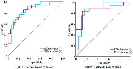 In Table 4, for females, the Cox and Snell R2 value, estimated at 0.502, and the Nagelkerke R2 value, estimated at 0.682, were relatively high compared to the R2 values in the regression analysis. Therefore, the model, which represents the relationship between the explanatory variables included in the model and their effectiveness, is statistically significant and considered appropriate. The factors of alcohol status, coffee status, jitter after treatment (Post-tx), jitter comparison, and shimmer before treatment (Pre-tx) were identified as important parameters influencing the effectiveness of voice therapy. Among these, coffee status, jitter after treatment (Post-tx), jitter comparison, and shimmer before treatment (Pre-tx) were found to have a significant impact. For males, the estimated model’s Cox and Snell R2 value is 0.232, and the Nagelkerke R2 value is 0.330; these values are relatively low compared to the R2 values in regression analysis. However, based on the p-value, this model was considered statistically significant and appropriate. It was found that jitter before and after treatment (Pre-tx and Post-tx and MPT before treatment (Pre-tx) significantly influence the effectiveness of voice therapy. Detailed verification results are presented in Table 4. Through the estimated coefficients and Wald statistics of the constructed model, along with the odds-ratio, it is possible to estimate how much each explanatory variable influences the effectiveness of voice therapy.