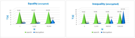 Figure 2, Figure 3, Figure 4, Figure 5 and Figure 6 present (in various forms) the results of a comparative analysis of the average times (in seconds—T) of the search for the required unencrypted (plaintext) and encrypted data with their full output for display depending on the number of obtained values (lines—N) when executing the corresponding SELECT query. Namely, queries that satisfy the main types of search conditions: comparison (equality, inequality), range, set membership (IN), pattern matching (Like). Two almost identical tables were used to obtain estimates of the corresponding time values. One table stored unencrypted data, and the other stored the same data in encrypted form. At the same time, the first table, unlike the second one (for encrypted data), was not associated with security policies (RLS and FGA). Figure 7 shows separately the average data search and decryption times (with their full output for display) for the case of encrypted data stored in the corresponding database table, depending on the number of obtained relevant data rows. The data search was performed in tables with more than 200,000 rows of records.