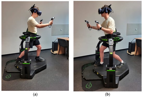 The empirical study was conducted in a group of 26 students from AWF, including 13 women (age: 23.4 ± 1.0 years, body height: 166.5 ± 5.3 cm, body mass: 60.0 ± 6.2 kg) and 13 men (age: 23.3 ± 2.0 years, body height: 182.0 ± 6.0 cm, body mass: 77.5 ± 12.5 kg). According to the accepted inclusion criteria, the study participants were healthy and physically fit volunteers. However, the study excluded those sensitive to flashing lights or image sequences found in programs and video games, suffering from epilepsy, having symptoms of motion sickness or balance disorders, with physical limitations (e.g., injuries) that could hinder exercises in a virtual environment, taking any medications that affect heart rate, and those who had previously used the application. The subjects’ previous experience with immersive VR technology varied. Nine people (34.6%) had previously used it, while the remaining 17 people (65.4%) had never experienced it. None of the participants had previously walked on the multidirectional treadmill connected with VR used in the study. The study was approved and reviewed by the Research Ethics Committee of the AWF (protocol number 9/2018).