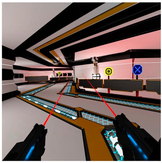 The study used the HTC Vive Pro VR headset, Omni omnidirectional treadmill (Virtuix; www.virtuix.com (accessed on 17 October 2023), and an AVRG game TRAVR Training Ops. The game consisted of overcoming obstacles in a virtual tunnel and shooting at designated moving and stationary targets with a laser weapon held in both hands. However, you should only shoot at the yellow targets marked with the “O” symbol and ignore those marked “X” symbol. The aim of the game is to score as many points as possible. The game result consists of several elements such as the speed of completing the stage, accuracy (the number of targets shot down and missed), and the number of shots fired. At the end of each stage, the participant runs to the board, where they write down their nickname and the number of points they have obtained, and the results of other players are shown, which may provide additional motivation for the user. The necessity to cover a designated route forces the player to perform locomotor movements (running, walking), engaging primarily leg muscles. The research involved two fifteen-minute sessions of AVRGs. There was a 30 min break between sessions, during which the participants rested in a sitting position. Two 2 kg AWs (one for each leg) fastened to the ankles of the left and right lower limbs were used to load the legs. Figure 1 shows the participant playing TRAVR Training Ops and the test stand, whereas Figure 2 shows a screenshot depicting the game environment.