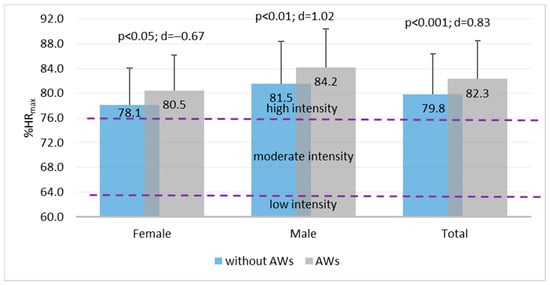 The study found that %Hrmaxmax was significantly lower (t = −4.23; p < 0.001; Cohen’s d = 0.83) for all participants playing AVGR without ankle weights (79.8 ± 6.5% HRmax) than when the ankles were loaded with the weights (82.3 ± 6.2% HRmax). Similar statistically significant relationships were observed in the separate analyses of the results obtained by men and women. For women playing without AWs, this parameter was 78.1 ± 5.9% HRmax and was significantly lower (t = −2.43; p < 0.05; Cohen’s d = −0.67) than while training in VR with AWs (80.5 ± 5.7% HRmax). Men were also significantly less fatigued (t = −3.69; p < 0.01; Cohen’s d = 1.02) exercising without (81.5 ± 6.9% HRmax) than with ankle weights (84.2 ± 6.3% HRmax). It should be stressed that regardless of the additional load on the legs, the intensity of PA during the game was at a high level recommended for health benefits (Figure 3).