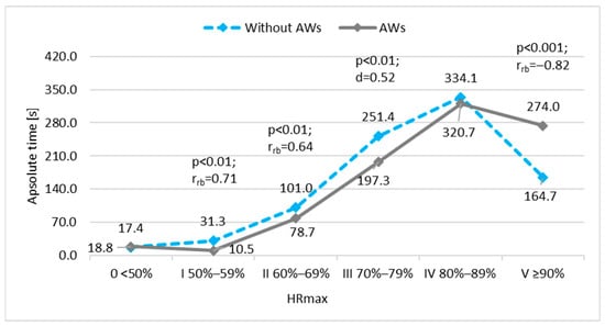 During both 15 min sessions, users’ HR remained for the longest time within the range of 80–89% HRmax. When playing without AWs, an effort of this intensity lasted 320.71 s, whereas for playing with AWs, users maintained this HR for 334.1 s. A comparison of the time spent in each HR zone in the two sessions revealed the greatest discrepancy in zone 5 (109.3 s) and the smallest in zone 0 (1.4 s). Statistically significant differences in results were observed for zone 1 (Z = 2.92; p < 0.01; rrb = 0.71), zone 2 (Z = 2.80; p < 0.01; rrb = 0.64), zone 3 (Z = 2.44; p < 0.01; rrb = 0.52), and zone 5 (Z = 3.42; p < 0.001; rrb = 0.82) (Figure 4).
