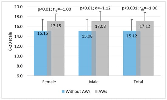 In the subjective rating of perceived exertion (RPE 6–20 scale) made by all students, playing without AWs was also found to be significantly less intense (Z = −3.92; p < 0.001; rrb = −1.00) than playing with AWs. The intensity was rated 15.12 ± 2.29 and 17.12 ± 1.70 points, respectively. Similar relationships were observed in both women (Z = 2.67; p < 0.01; rrb = −1.00) and men (t = −4.05; p < 0.01; Cohen’s d = −1.12). Women rated the intensity of exercise during AVRG without AWs at 15.15 ± 2.30 points and with AWs at 17.15 ± 1.41 points. The men estimated the intensity of playing without leg load at 15.08 ± 2.36 points and with load at 17.08 ± 2.02 points. Relating these values to the classification of physical exercise intensity [32] shows that the students rated physical exercise as vigorous both with and without AWs (Figure 5).