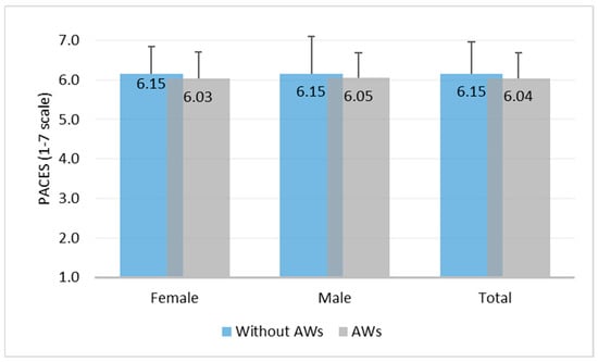 Based on the PACES survey (on a scale from 1 to 7), students rated PA while playing TRAVR Training Ops as high, regardless of whether they exercised without (6.15 ± 0.81) or with loading (6.04 ± 0.64). There were also no statistically significant differences in the evaluation made by users of either sex. Women rated the PA in VR without AWs at 6.15 ± 0.69 points and with AWs at 6.03 ± 0.67 points. For men, the results were very similar, with 6.15 ± 0.94 and 6.05 ± 0.63 points, respectively (Figure 6).