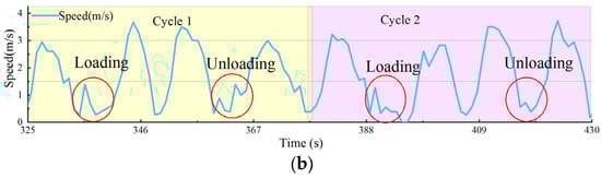 The vehicle speed not only reflects the dynamic demand of electric loader, but also describes the braking demand of electric loader under different working conditions. This paper takes a self-developed 5-ton electric loader as test object. The 20 loading operations were carried out under the “V” and “T” types, respectively. Two consecutive sets of data are selected to analyze the vehicle speed change under acceleration and deceleration conditions. As shown in Figure 1, the speed curve of each working cycle includes six working stages: forward with no-load, loading, backward with full-load, forward with full-load, unloading, and backward with no-load. During forward with no load, the digging depth of bucket is ensured by a short time stepping on accelerator pedal. Therefore, a small speed spike will appear when loading. In the “V” type, the speed peak will also appear when the sand is unloaded to the top of the sand pile with acceleration.