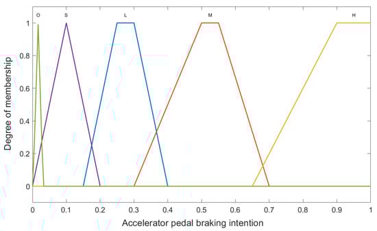 Combining with the rules and the engineering experience, the ranges of deceleration intentions are divided. Because of the deceleration intention domain is [0, 1] by the experiment data, the partition range of O is [0, 0.0156, 0.0312], the partition range of S is [0, 0.1, 0.2], the partition range of L is [0.15, 0.25, 0.3, 0.4], the partition range of M is [0.3, 0.5, 0.55, 0.7], and the partition range of H is [0.65, 0.9, 1, 1], respectively. Because there is a certain fuzziness in the division of intention, each intention have a small part of the intersection. In order to enhance the identification sensitivity of deceleration intention under high speed and emergency braking conditions, the range of left-diagonal is large when dividing the deceleration intention of H. The membership functions of deceleration intention are shown in Figure 3.