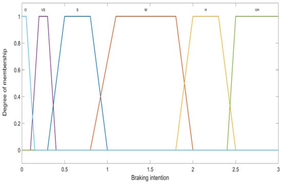 The different combination data of brake pedal displacement and displacement change rate were collected during the experiment. Considering that the intentions were similar under some combination conditions, the paper divided the braking intention into zero intention, very low intention, low intention, medium intention, high intention and very high intention, which adjusted by actual braking condition. The braking intentions are successively defined as O, VS, S, M, H, and VH. Because of the braking intention domain is [0, 3] by the experiment data, the partition range of O is [0, 0, 0.05, 0.15], the partition range of VS is [0.1, 0.2, 0.3, 0.4], the partition range of S is [0.3, 0.5, 0.8, 1], the partition range of M is [0.8, 1.1, 1.8, 2], the partition range of H is [1.8, 2, 2.3, 2.5], the partition range of VH is [2.4, 2.5, 3, 3]. The membership functions of braking strength are shown in Figure 6 and the fuzzy control rules of braking intention are formulated as shown in Table 4.