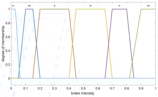When dividing the braking strength, the braking intention is considered as the main factor and the speed is considered as the secondary factor. The braking strength is divided into zero strength, very small strength, small strength, medium strength, high strength, and very high strength, which are successively defined as O, VS, S, M, H and VH. The division range of moderate braking strength M is large base on the consideration of the high probability of moderate braking intention M and moderate vehicle speed M. Because of the braking strength domain is [0, 1] by the experiment data, the partition range of O is [0, 0, 0.03, 0.06], the partition range of VS is [0.05, 0.1, 0.15, 0.2], the partition range of S is [0.15, 0.2, 0.4, 0.45], the partition range of M is [0.4, 0.45, 0.65, 0.7], the partition range of H is [0.65, 0.7, 0.8, 0.85] and the partition range of VH is [0.82, 0.9, 1, 1], respectively. The membership functions of braking strength are shown in Figure 7 and the fuzzy control rules of braking strength are formulated as shown in Table 5.