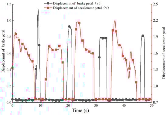The displacement curves of accelerator pedal and stepping brake pedal for four sliding braking conditions.