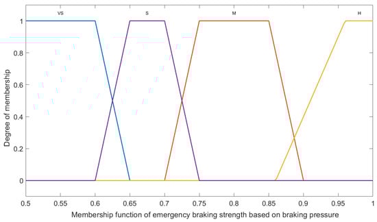 To improve braking reliability, hydraulic brake pressure is taken as a supplementary condition for braking intention identification in this paper. When the system detects hydraulic brake pressure with no brake pedal voltage signal, it identified as emergency braking intention. Considering the influence of emergency braking intention and vehicle speed on emergency braking strength, the emergency braking strength was divided into small strength, small strength, medium strength, and high strength, which were successively defined as VS, S, M and H. Figure 9 shows the membership functions of emergency braking strength identification based on hydraulic brake pressure.