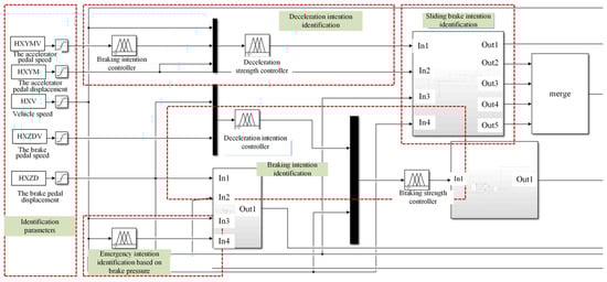 As shown in Figure 10, this paper builds a flow chart of braking intention identification based on accelerator pedal and brake pedal, and emergency intention identification strategy based on brake pressure. The vehicle speed, brake pedal speed, accelerator pedal speed, and hydraulic brake pressure are obtained through the corresponding sensors and data processing, which are used as the judgment conditions of braking intention identification strategy module.