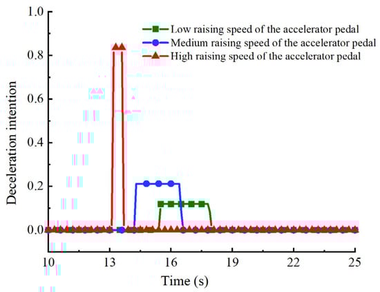 As seen from the Figure 12, the deceleration intention increases with the increase in raising speed of the accelerator pedal, which satisfies that the higher raising speed of the accelerator pedal, the stronger the deceleration intention. This indicates that the strategy has good effect on different deceleration intention identification.