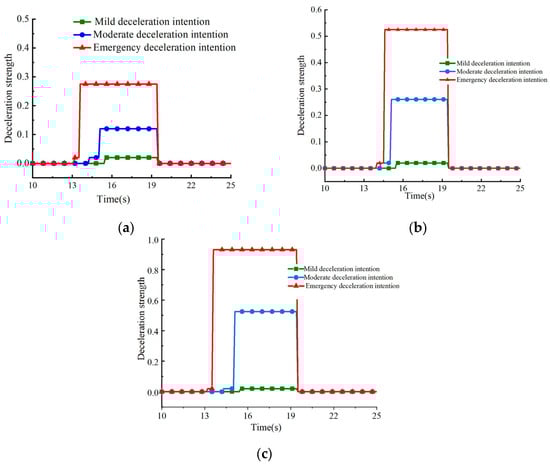 As seen from Figure 13, the deceleration strength increases with the increase in speed under the same deceleration intention, which accords with the deceleration demand in the actual driving process. Moreover, the deceleration strength under the mild deceleration intention is almost equal weather at speed of 6 m/s or 12 m/s, the speed has no amplification effect under this kind of condition.