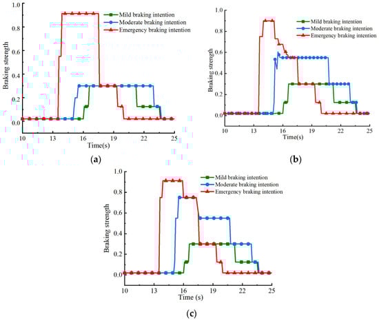 As seen from Figure 14, the identification strategy is less sensitive to mild and moderate braking intentions under low speed. The braking strength has a significant difference and shows an increasing trend with the increase in speed under the same braking intention, which satisfies the driver’s braking demand. In the emergency braking intention, the braking strength under three different speeds conditions are all greater than 0.9, which is not affected by speed. This ensures the braking safety under the emergency braking intention.