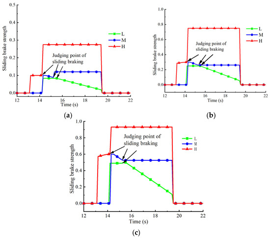 Figure 15a–c shows the sliding brake strength under different braking intentions and three different speeds, respectively. Where, L represents releasing accelerator pedal only with no brake pedal displacement, namely mild braking intention. M represents releasing accelerator pedal, and then stepping on brake pedal gently after 2 s, namely moderate braking intention. H represents releasing accelerator pedal, and stepping on brake pedal quickly after 2 s, namely emergency braking intention. As seen from the L curves in three figures, when the driver releases accelerator pedal only without stepping on the brake pedal, the sliding brake strength is provided after maintaining the original deceleration strength of 1.3 s. And the sliding brake strength decreases as the speed is decreasing. As seen from M and H curves in three figures, the sliding brake strength will be provided within 1.3 s to 2 s, and the deceleration strength continues to be provided after 2 s. The strength increases with the increase in speed under the same intention. This has good performance on sliding brake identification.