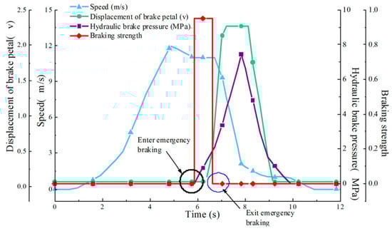 As seen from Figure 16, the brake pedal displacement is 0 at time 5.7 s, but the brake pressure is detected at the same time, the system begins to provide emergency braking strength, immediately, and the speed decreases accordingly. When the system detects brake pedal displacement signal exceeding 500 mV at 6.6 s, it exits emergency braking intention identification and outputs the corresponding braking strength. The vehicle speed drops to zero when the brake pedal displacement signal reaches the maximum. The whole braking logic meets the actual braking demand. Therefore, the proposed emergency braking intention identification based on braking pressure has a good effect, and the hidden trouble caused by excessive dead zone of brake pedal or signal delay are solved.
