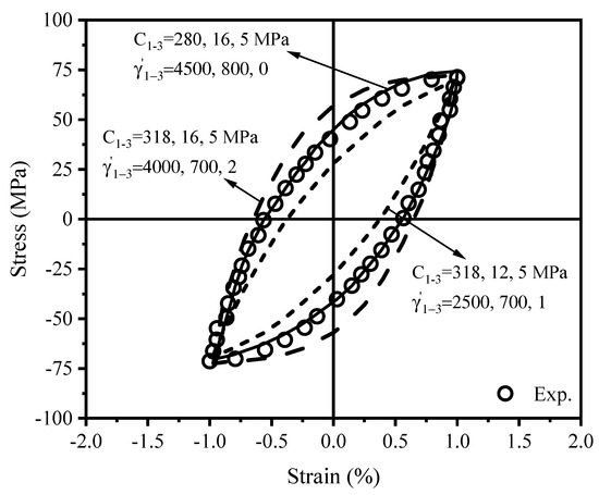 The coefficients of the Chaboche hardening rule were determined from stress–strain hysteresis loops obtained from strain-controlled testing results. A proper set of material coefficients were acquired as the simulated and measured hysteresis loops overlap closely with nearly the same shape and size. Figure 3 presents the comparison of three different sets of Chaboche coefficients for the Al 4043 sample tested under constant strain amplitude of ±1%. The deviation of the simulated and the measured data in Figure 3 is attributed to the values taken as material coefficients of and . The wider loop in Figure 3 was obtained as increased from 280 to 318. In constant to , as coefficients and reduced, narrower loops were achieved. For Al 4043 alloy, Chaboche coefficients of = 280, 16, and 5 GPa and = 4500, 800, and 0 resulted in a tight overlap of the experimental and simulated loops. The material properties and coefficients for AM Al 4043 alloy were tabulated in Table 1.