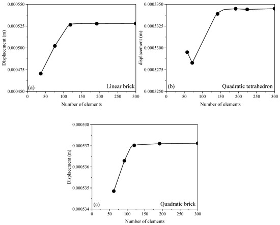 The convergence of displacement for each element type was studied to determine the independent nature of the result from the number of elements. Figure 5a presents the convergence curve for the linear brick element. As the number of elements increased, there was no substantial change in the result and the convergence was achieved at 119 elements. The quadratic tetrahedron element in Figure 5b shows a constant displacement when the number of taken elements exceeded 190. In this figure, as the number of elements was increased from 192 elements to 500 elements, the difference in displacement was found to be lower than 0.14%. The trend of convergence the quadratic brick elements in Figure 5c revealed that there was no significant change in the result above 120 elements and the model converged at this point. A sufficient number of elements led to an accurate estimation of the maximum and minimum strain values at the mid-section (gauge length) of samples.