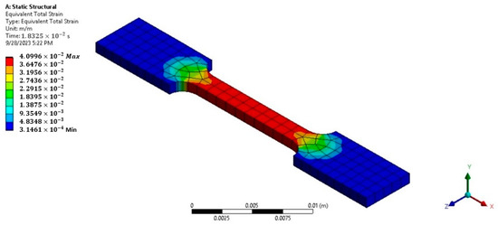 Figure 6 exhibits the contour plot presentation of total strain for the AM Al 4043 sample under cyclic loading of 75 ± 60 MPa. The maximum total strain of 0.040996 was achieved at the specimen gauge length with the smallest area. The minimum strain of 0.000314 was obtained in the locations farther than critical area. In a distance far enough from this section, the contour lines of the total strain stay constant. As the elements corners are nodal locations, the Gaussian integration points are positioned within the element. Contour plots are generated from FE results by extrapolating stress and strain values from Gaussian integration points to nodal locations. This extrapolation process is performed using the shape functions. Table 2 presents the details of element type, shape, and nodal features employed in this study.