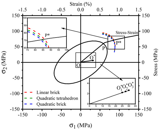 In the deviatoric stress space, the backstress increments represent the magnitude and direction of the yield surface translation over the loading process beyond the elastic limit. According to Chaboche postulation, the backstress increment was achieved through integration of backstress increments, . Figure 7 represents the yield surface translation for the AM aluminum sample for three different element types. The initial yield surface of the Al 4043 sample is depicted by a solid line. This figure also presents the stress–strain curve of additively manufactured Al 4043 through using right vertical and upper horizontal axes. When the applied load increases beyond the elastic limit, the yield surface translates (dashed-line surfaces) into the deviatoric stress space, intercepting the stress–strain curve. Beyond the elastic limit, the initial yield surface of Al 4043 with the origin of O was shifted to center . The translated yield surface is shown with dashed lines intercepting the stress–strain curve at point . The evolution of the yield surface by means of different element types resulted in the same direction of backstress increment with various magnitudes as shown in Figure 7. The lower amount of backstress increment resulted in a smaller vector of achieved through the second-order brick elements, while the linear brick elements possessed a larger translation from . By surpassing the yield limit, the origin of the yield surface with the second-order tetrahedron element was shifted to and was placed between the translated centers for two other element types.