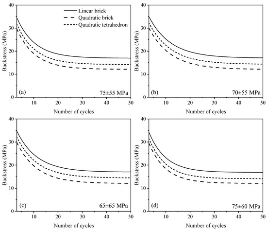 The mean values of backstress increments determined from the peak and valley of each loading cycle were plotted for different element types at various applied stress levels in Figure 8. The yield surface translation was governed by the Chaboche hardening rule through the backstress increments as the number of cycles progressed. Figure 8 shows that as the number of cycles increases, the average backstress moderately declines and results in a steady-state condition at longer cycles. The average backstress through using the second-order brick elements possessed a lower amount as compared to other element types. The highest backstress increment was associated with the first-order brick elements, which manifested the larger translation of the yield surface in Figure 7. The backstress curve of the quadratic tetrahedron element collapsed between the two other element curves consistent with the vector and the corresponding translated yield surface.