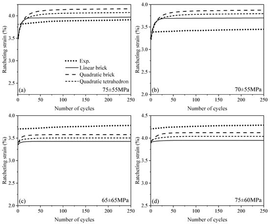 The ratcheting response of AM Al 4043 samples under different stress levels was simulated through the finite element method and different element types, shapes, and nodes. The Chaboche kinematic hardening rule as a material model in Ansys software was employed to evaluate the ratcheting response of Al 4043 samples with three different element types. Figure 9 illustrates the simulated ratcheting strain curves for aluminum samples tested at 75 ± 55 MPa, 70 ± 55 MPa, 65 ± 65 MPa and 75 ± 60 MPa. In each loading condition, the simulated ratcheting curves through using quadratic brick elements resulted in larger magnitudes, while the ratcheting level declined, respectively, for the quadratic tetrahedron and the linear brick elements. The simulated curves based on different element types revealed that the ratcheting amount was increased by increasing the stress levels. The ratcheting magnitude was increased by as high as 12% in Figure 9b as compared with the simulated ratcheting curve in Figure 9a as the stress amplitude was increased from 70 MPa to 75 MPa. The simulated ratcheting curves closely agreed with the experimental values. The deviation of simulated ratcheting curves from those of measured values stayed between 2% and 12%.