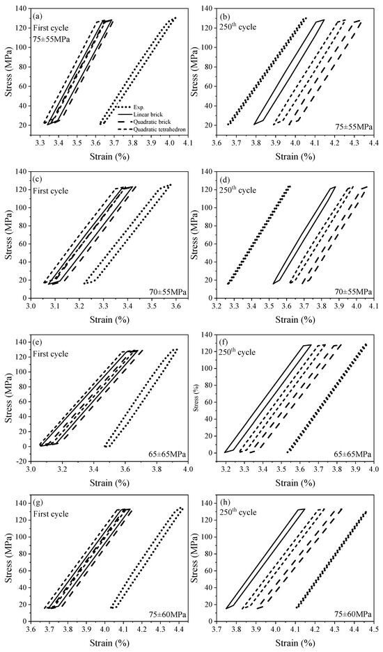 The simulated stress–strain hysteresis loops with different element types for the 1st and 250th cycles and their corresponding measured loops at different stress levels of (a,b) 75 ± 55 MPa, (c,d) 70 ± 55 MPa, (e,f) 65 ± 65 MPa, (g,h) 75 ± 60 MPa.