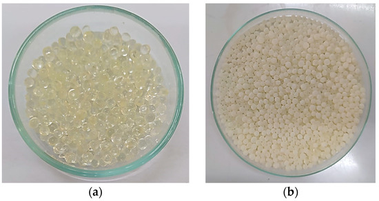 (a) Pristine E100 granules; and (b) homogeneous mixture of E100 and Hsp for the extrusion process.