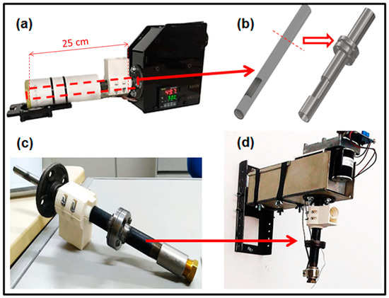 (a) Original mini-extruder machine; (b) illustration of the extruder’s metallic cylindrical reservoir, before and after adaptations; (c) physical apparatus of the modified reservoir; and (d) adapted extruder, with reservoir in vertical position.