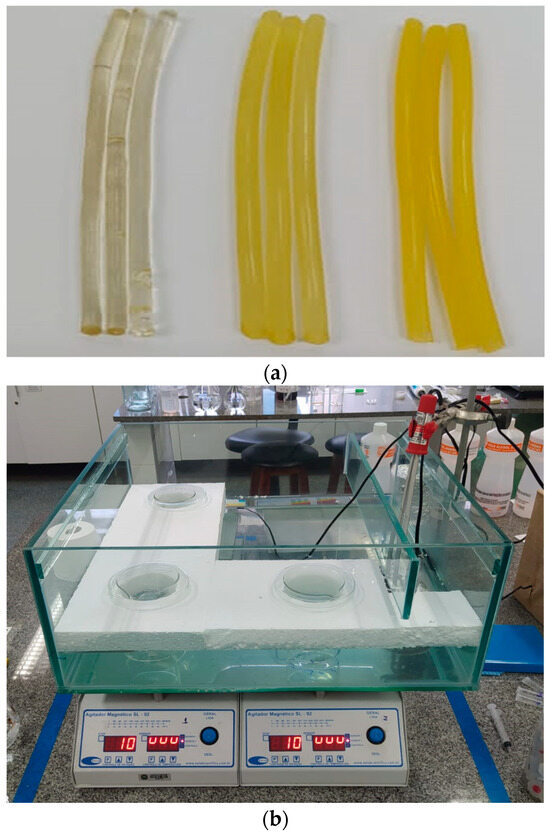 (a) Samples in triplicate for drug dissolution tests (from left to right, E100, E100/Hsp(−), and E100/Hsp(+) filaments). (b) Detail of the experimental apparatus used for in vitro drug dissolution tests.