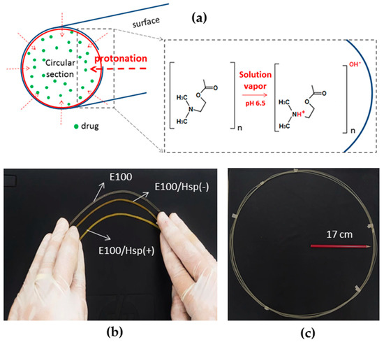 Under the action of steam from the protonation solution (pH = 6.5, slightly acidic, close to the basic medium transition), the dimethylamino groups of the polymeric molecule are repelled from each other, from the outermost layers of the filament to the bulk of the material (with a radial direction, Figure 5a). When the process is interrupted, the dimethylamino functional group in the more superficial monomers tends to retract, making it difficult for this event to occur in the inner layers of the filament. This gradient gives the filament the highest flexural strength noted in the tests. An image of the flexible filaments is shown in Figure 5b. In addition, it was noted that 24 g of polymer, in each experiment, can produce around 4 m of filament with constant diameter, for each of the three types of materials tested (E100, E100/Hsp(−) and E100/Hsp(+)). Figure 5c exemplifies a sample of continuous and complete E100 filament obtained via hot-melt extrusion (HME), at 130 °C.