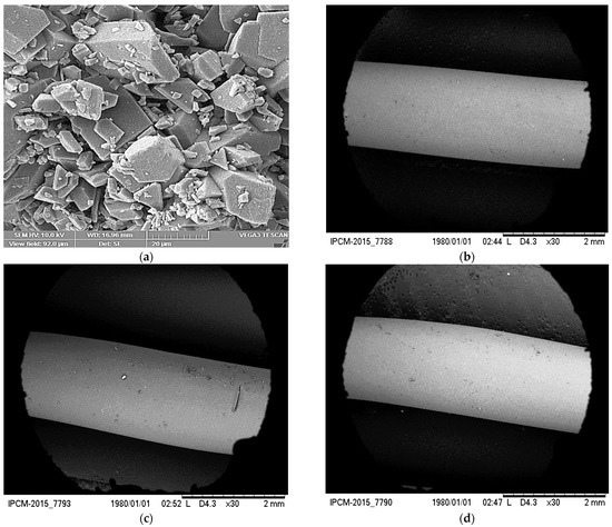 SEM micrographs of the (a) model drug Hesperidin (Hsp), and (b) E100, (c) E100/Hsp(−) and (d) E100/Hsp(+) filaments.