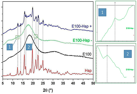 In addition, detailed zoomed portions of Figure 7, (1) and (2), show the existence of two diffraction peaks of the drug in the E100/Hsp(−) filaments, at angles 2θ = 12.4° and 21.4°, indicating the presence of Hsp in the composite. The XRD spectrum of the E100/Hsp(+) filament has its baseline shifted to higher intensities, following the curvature of the E100 spectrum, in the range 2θ = 12–27°. In this same range, there are peaks that were previously detected in the Hsp spectrum, which indicates the presence of the crystalline phase of the drug in the filament.