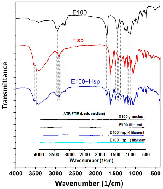 FTIR spectra of the pristine Hsp drug sample and E100 and E100/Hsp filaments. This figure shows the ATR-FTIR spectra of basic medium solutions (pH = 7.2) containing samples of the polymer in its original form and of the studied filaments.