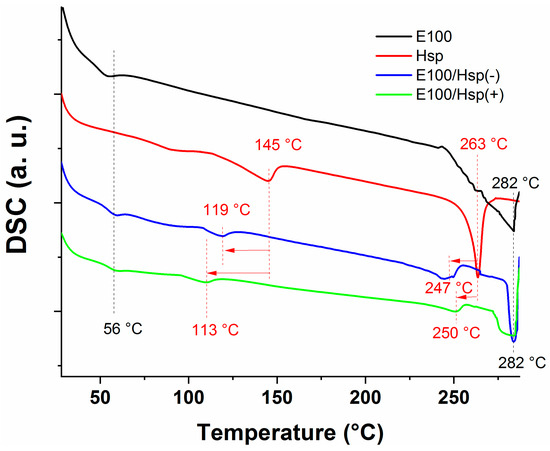 DSC curves of the pristine Hsp, and E100, E100/Hsp(−), and E100/Hsp(+) filaments.