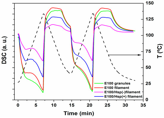 Cyclic DSC heating and cooling curves for the E100 granules, and E100, E100/Hsp(−), and E100/Hsp(+) filaments.