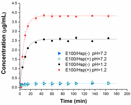 The results of the drug dissolution tests in simulated gastric and intestinal fluids (pH = 1.2 and pH = 7.2, respectively) are shown in Figure 11. In each solution, the drug release profiles were verified from E100/Hesperidin filament samples at low (E100-Hsp(−)) and high (E100-Hsp(+)) concentration levels.