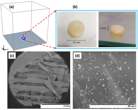 (a) CAD project of the pharmaceutical solid solution model part, produced from E100-Hsp(−) filaments; (b) 3D printed part; (c) inner circular section of the part, in the sixteenth layer of filament deposition; and (d) distribution of Hesperidin particles into E100 matrix.
