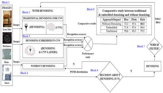 - For the traditional denoising approach, firstly, denoising is carried out separately with a filter as a pre-processing step. Secondly, denoised images are utilized in CNN for the performance study of a particular application (e.g., object recognition), which is mentioned in block 2 of Figure 1.