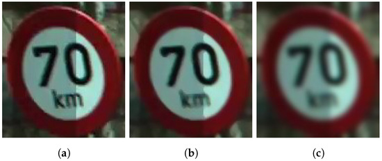 Images of the shadow without denoising and denoising with median and Gaussian filter for CURE-TSR dataset. (a) Without filter. (b) After median filter. (c) After Gaussian filter.